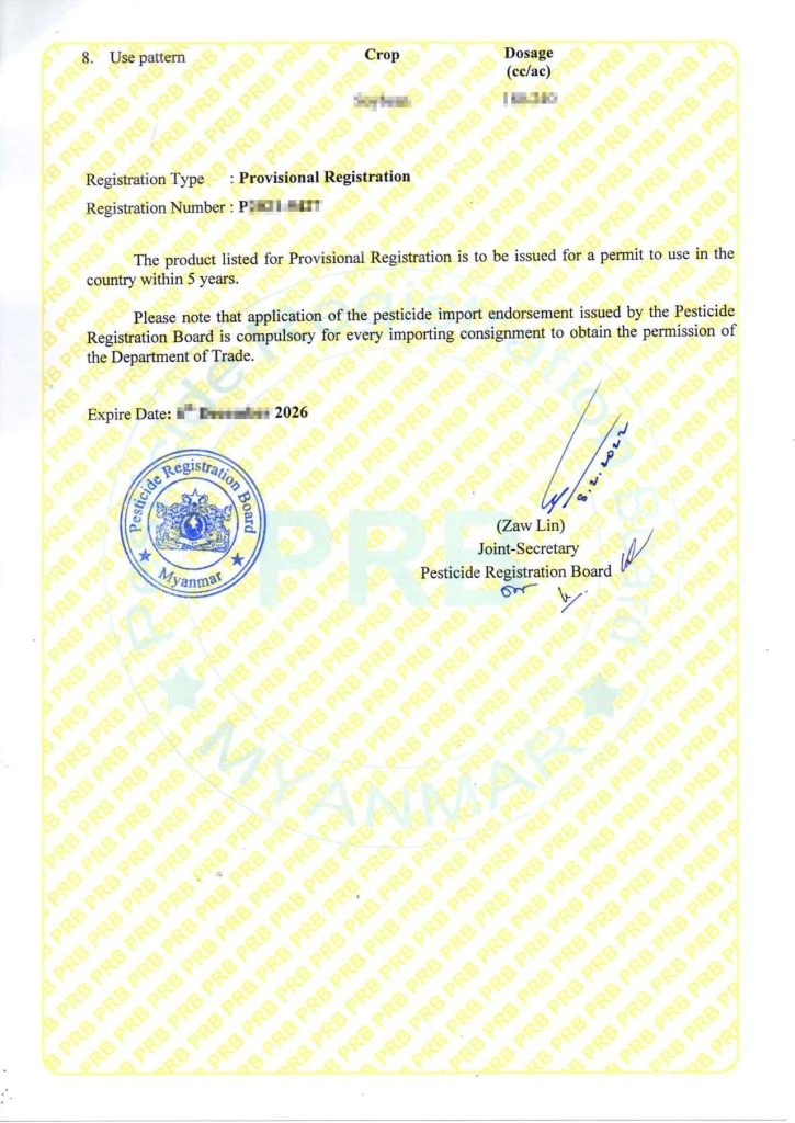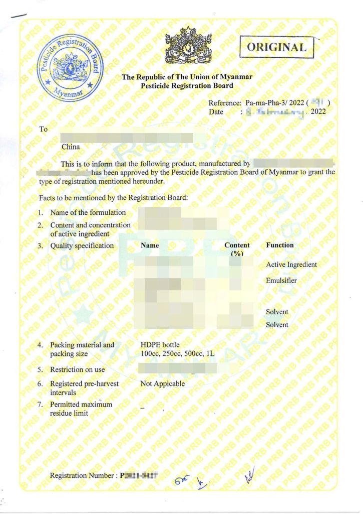 Образец свидетельства о регистрации пестицидов в Мьянме